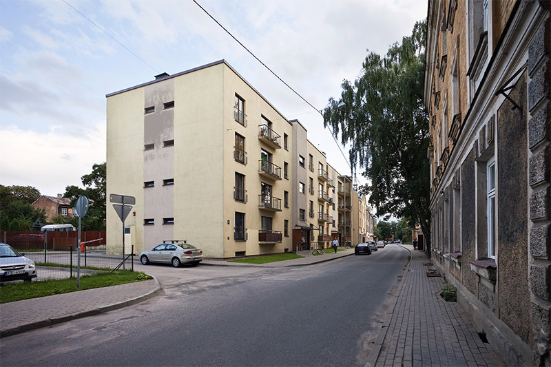 Starp ēkām izbūvētas pagalma autostāvvietas automašīnu novietošanai.