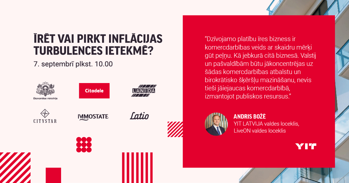 “Dzīvojamo platību īres bizness ir komercdarbības veids ar skaidru mērķi gūt peļņu. Kā jebkurā citā biznesā. Valstij un pašvaldībām būtu jākoncentrējas uz šādas komercdarbības atbalstu, birokrātisko šķēršļu mazināšanu, ja tā ir svarīga to funkciju veikšanai, nevis tieši jāiejaucas komercdarbībā, izmantojot publiskos resursus,” atzīmē Andris Božē, YIT LATVIJA valdes loceklis, LiveON valdes loceklis.